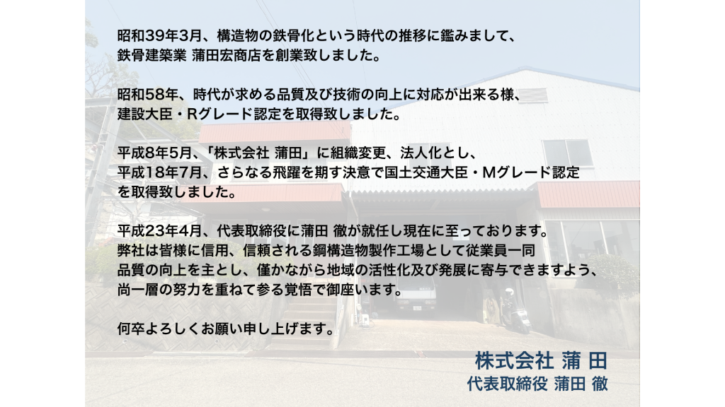 | 代表者 | 代表取締役 蒲田 徹 (平成23年4月〜) |